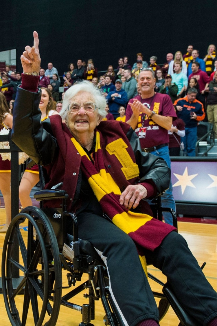 她在全美被廣泛報(bào)道是因?yàn)樵?018年,她隨校隊(duì)出席瘋狂三月賽事,那一年他們成為黑馬打進(jìn)了最終四強(qiáng)。而Sister Jean在比賽中因?yàn)橘惽皫ш?duì)祈禱、坐在場(chǎng)邊鼓勵(lì)球員、給他們精神支持而受到了廣泛關(guān)注。