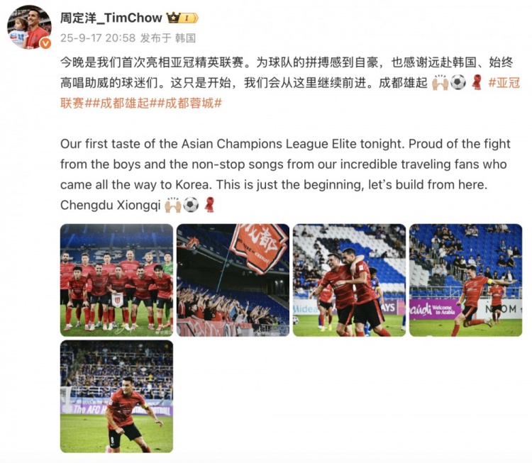 在蓉城隊(duì)史首場亞冠正賽惜敗之后,周定洋在社媒曬出現(xiàn)場照片并配文寫道:“今晚是我們首次亮相亞冠精英聯(lián)賽。為球隊(duì)的拼搏感到自豪,也感謝遠(yuǎn)赴韓國、始終高唱助威的球迷們。這只是開始,我們會從這里繼續(xù)前進(jìn)。成都雄起 ????????”