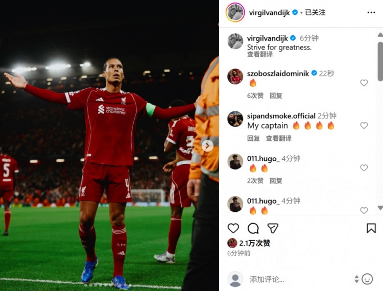 范迪克也在個(gè)人社媒曬出慶祝進(jìn)球照片,配文寫道:“努力追求偉大!”