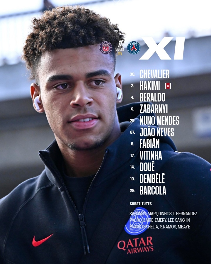 30-舍瓦利耶、2-阿什拉夫、4-貝拉爾多、6-扎巴爾尼、25-努諾-門德斯、87-若昂-內維斯、8-法比安-魯伊斯、17-維蒂尼亞、14-杜埃、10-登貝萊、29-巴爾科拉