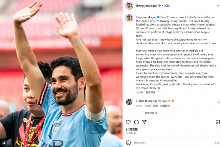 9月3日訊 34歲的德國中場京多安已經(jīng)官宣加盟加拉塔薩雷,他也通過社媒發(fā)布了向曼城的告別信:
