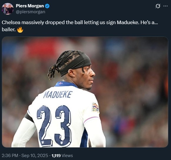 9月10日訊 英國(guó)名嘴、阿森納擁躉皮爾斯-摩根在推特曬照,稱(chēng)贊馬杜埃凱。
