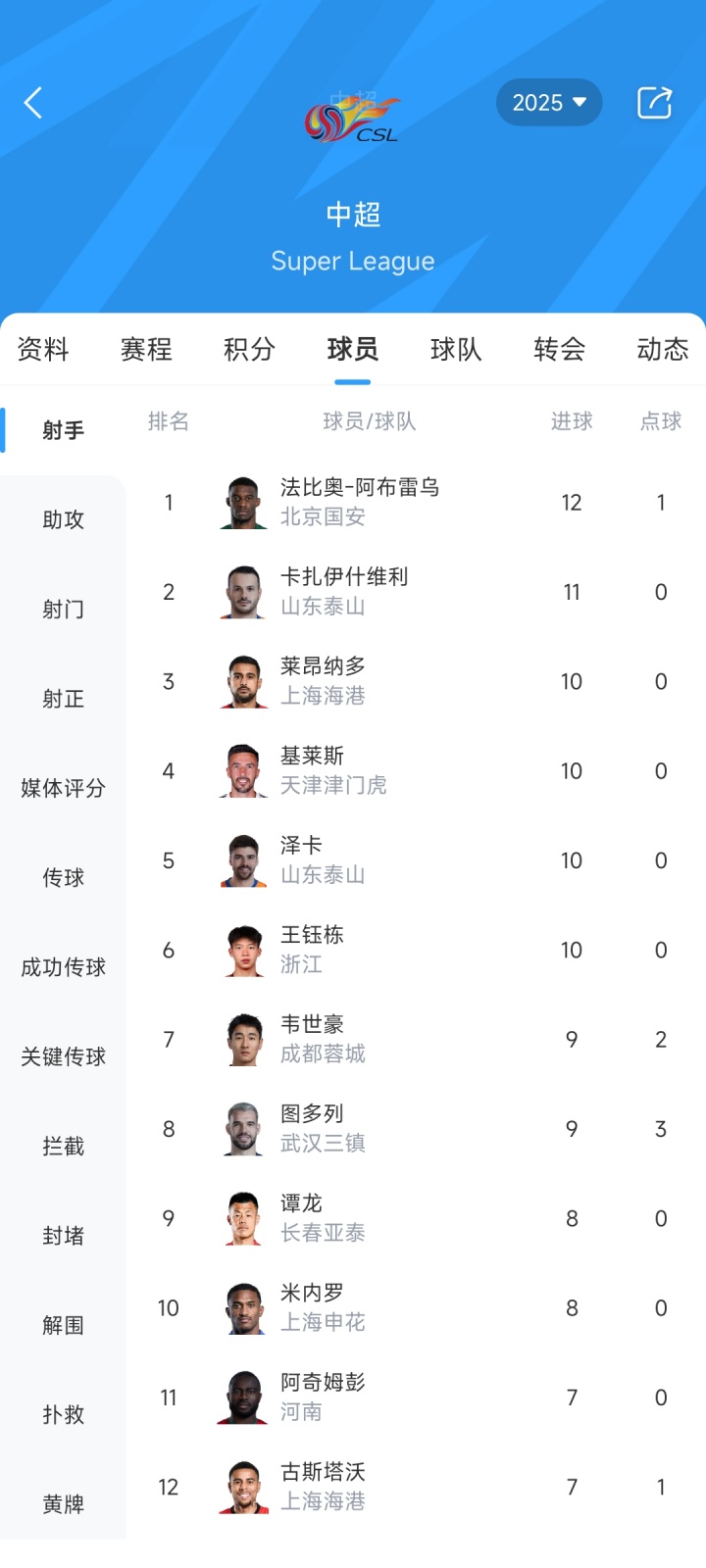 中超射手榜上,國安前鋒法比奧繼續(xù)以12粒進(jìn)球獨(dú)占鰲頭,泰山外援卡扎伊什維利憑借本輪的帽子戲法,11球躍升至射手榜第2;萊昂納多、基萊斯、澤卡、王鈺棟4人10球并列第3名。