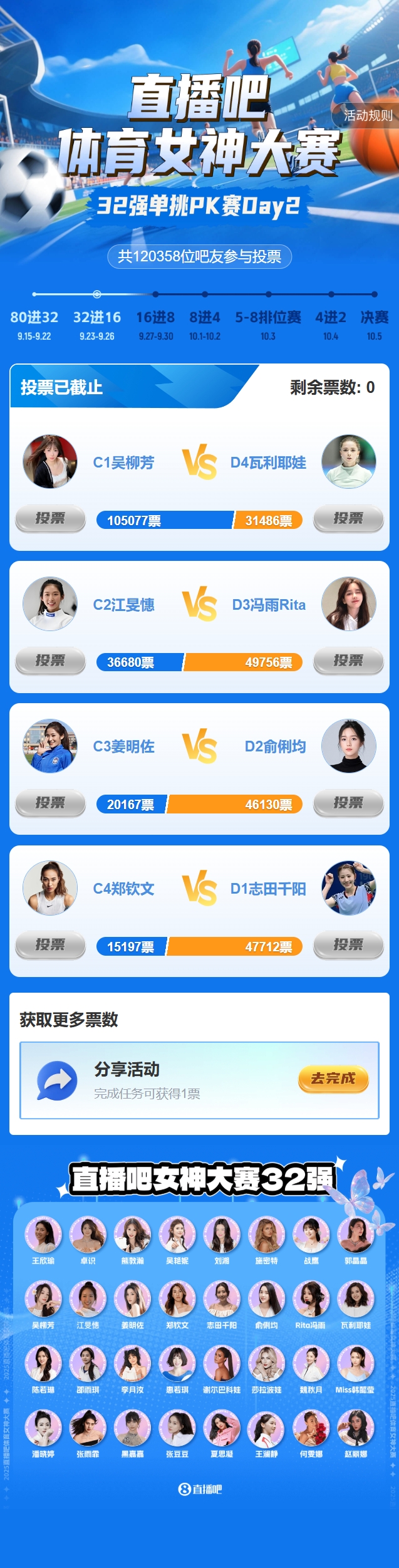 2025年『體育女神大賽』昨日進(jìn)入32強(qiáng)單挑PK賽階段,Day2(C組、D組)的結(jié)果如下: