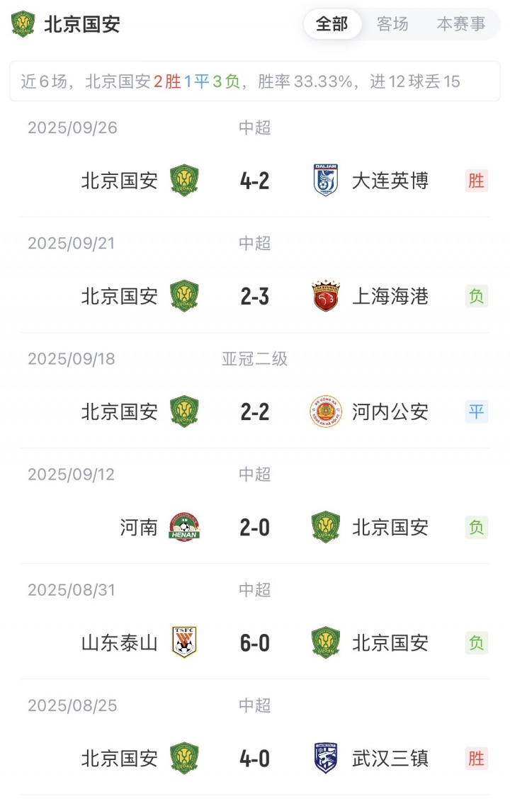 國(guó)安與麥克阿瑟此前還未交手過(guò),雙方近6場(chǎng)比賽戰(zhàn)績(jī)?nèi)缦拢?/p>